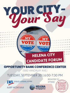 The League of Women Voters of the Helena Area (LWVHA), in partnership with AARP Montana and the Helena Area Chamber of Commerce, invites you to Your City, Your Say: Candidate Forum for Helena Mayor and City Commissioners.
